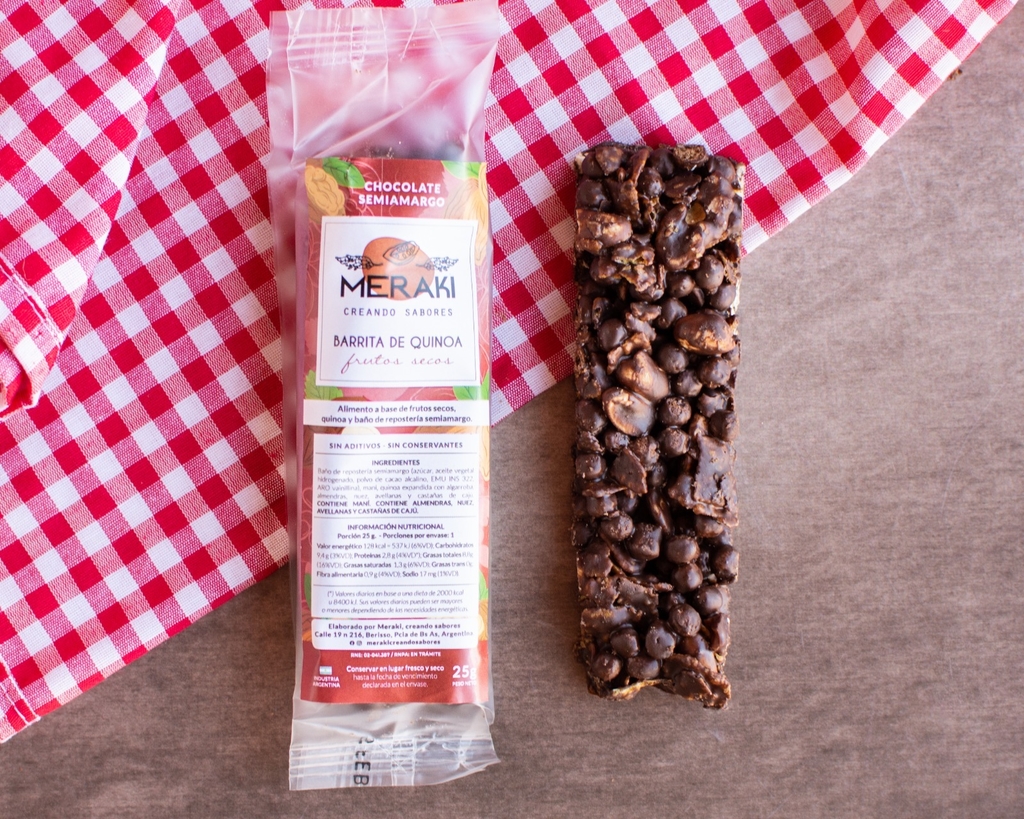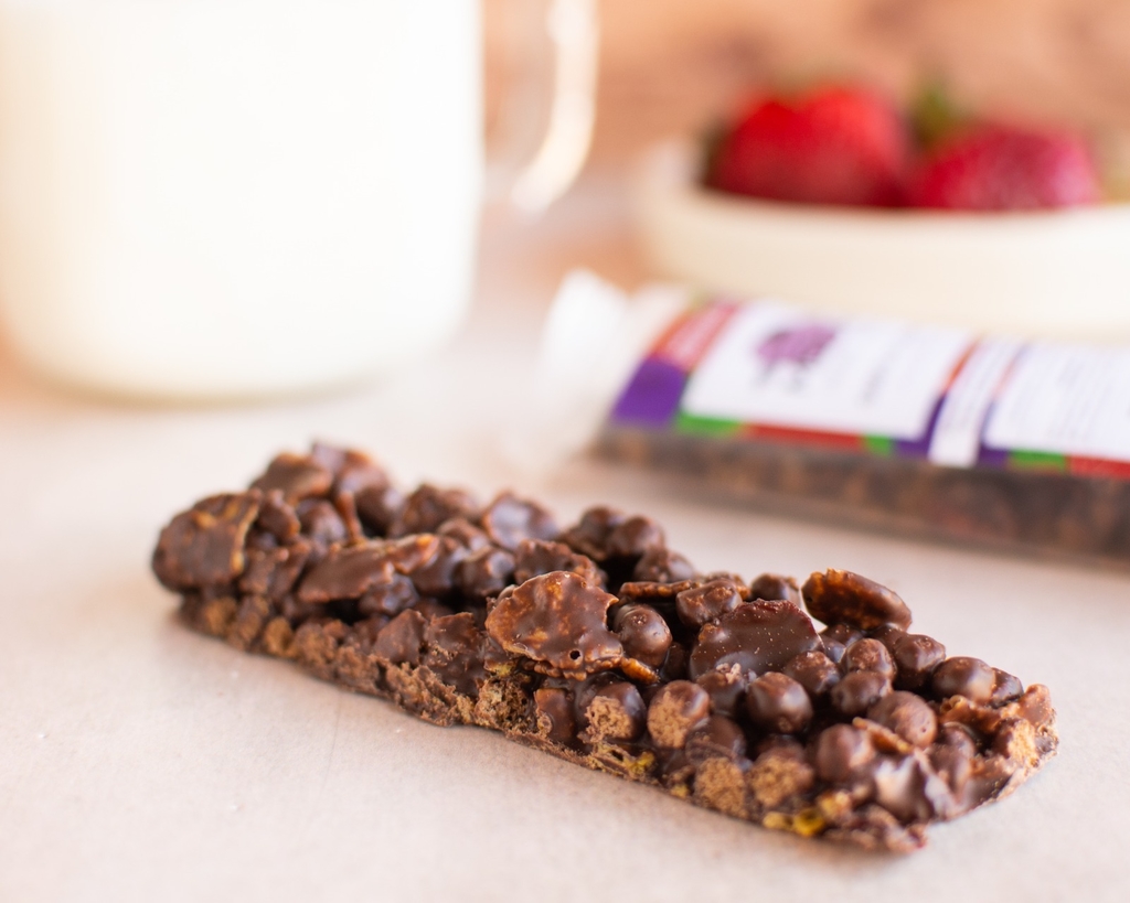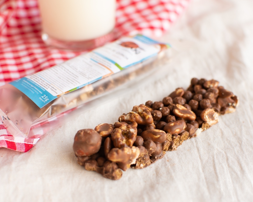Es una barrita crocante de chocolate, donde se la combina con ingredientes variados para que pueda aportar un balance nutricional adecuado, y en simultáneo, darnos el gusto por algo dulce.